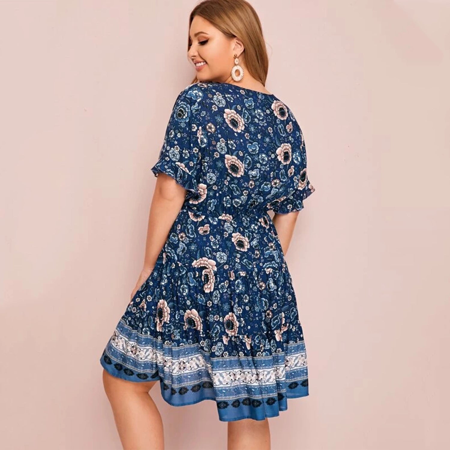 👗 Adopte un look frais et féminin avec cette robe imprimée grande taille à col en V, parfaite pour la saison printemps-été !